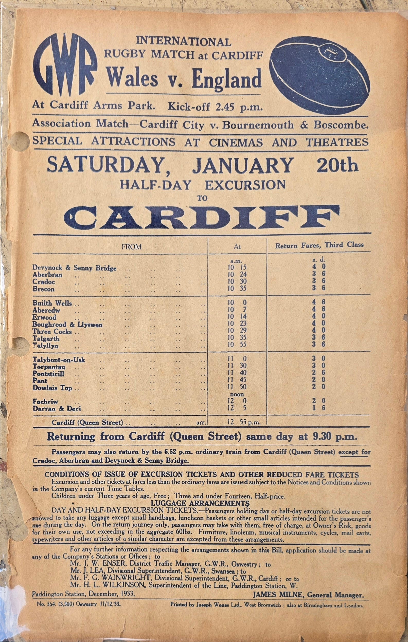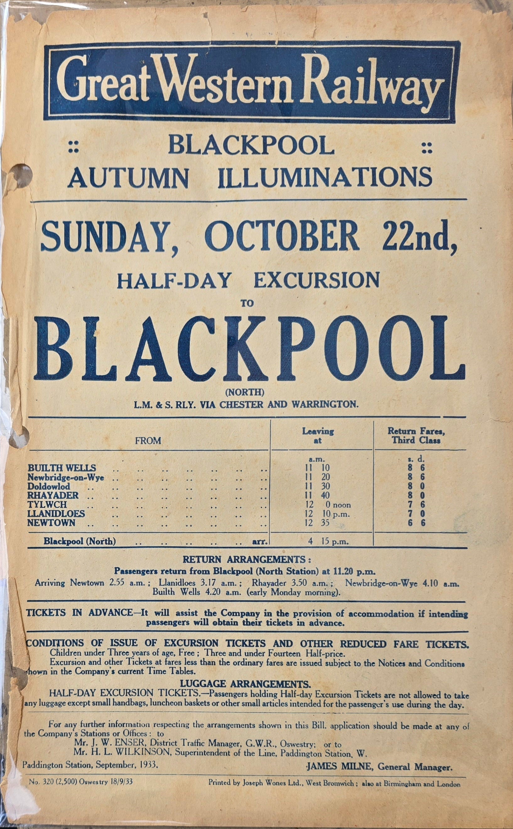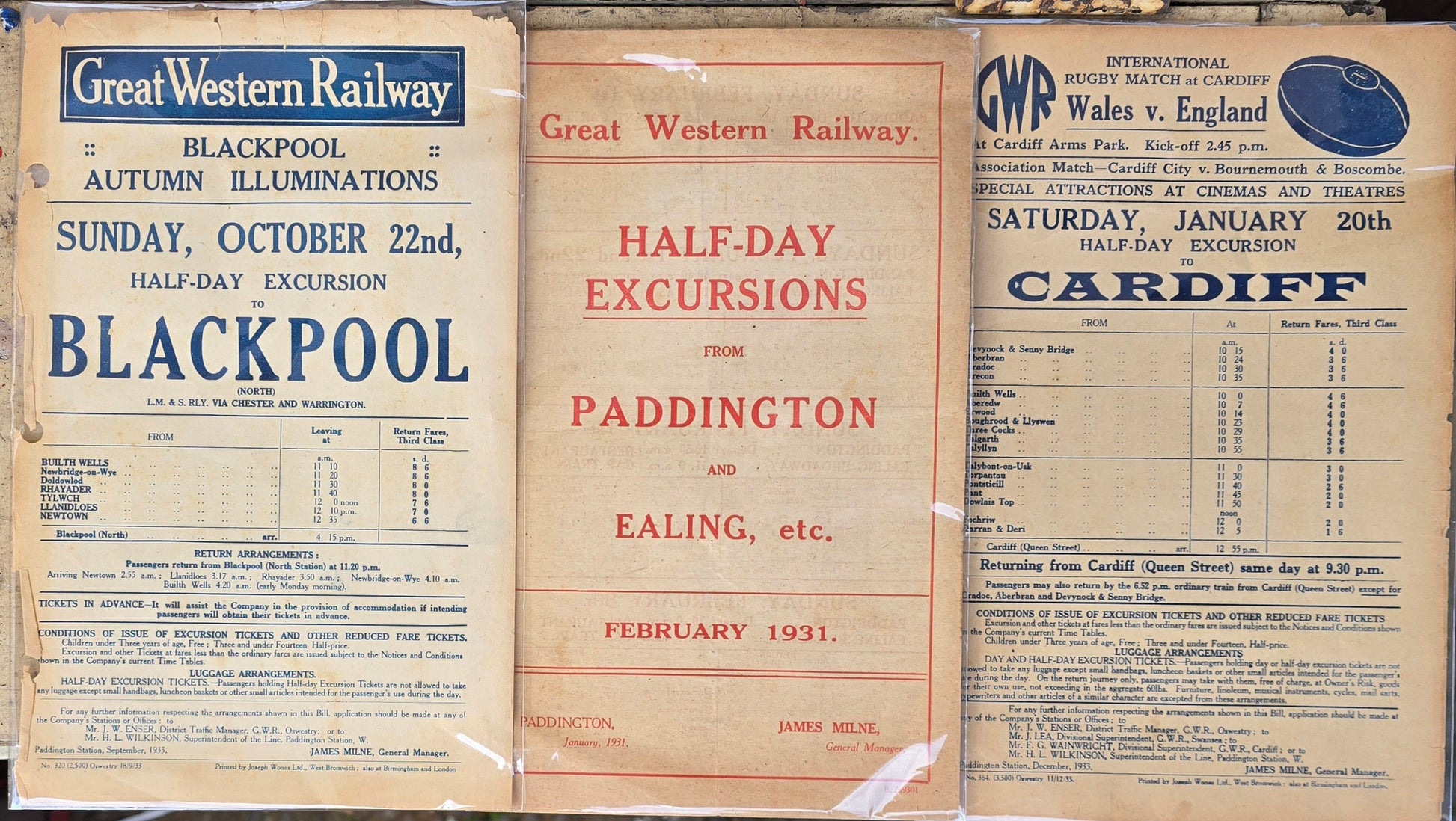 A collection of three Great Western Railway flyers advertising Blackpool Illuminations, excursions from Paddington and International Rugby match Wales v. England in 1933. Each flyers comes in a protective Cellophane pouch, thta why some glare is on pictires, these all measure 10" X 6".
