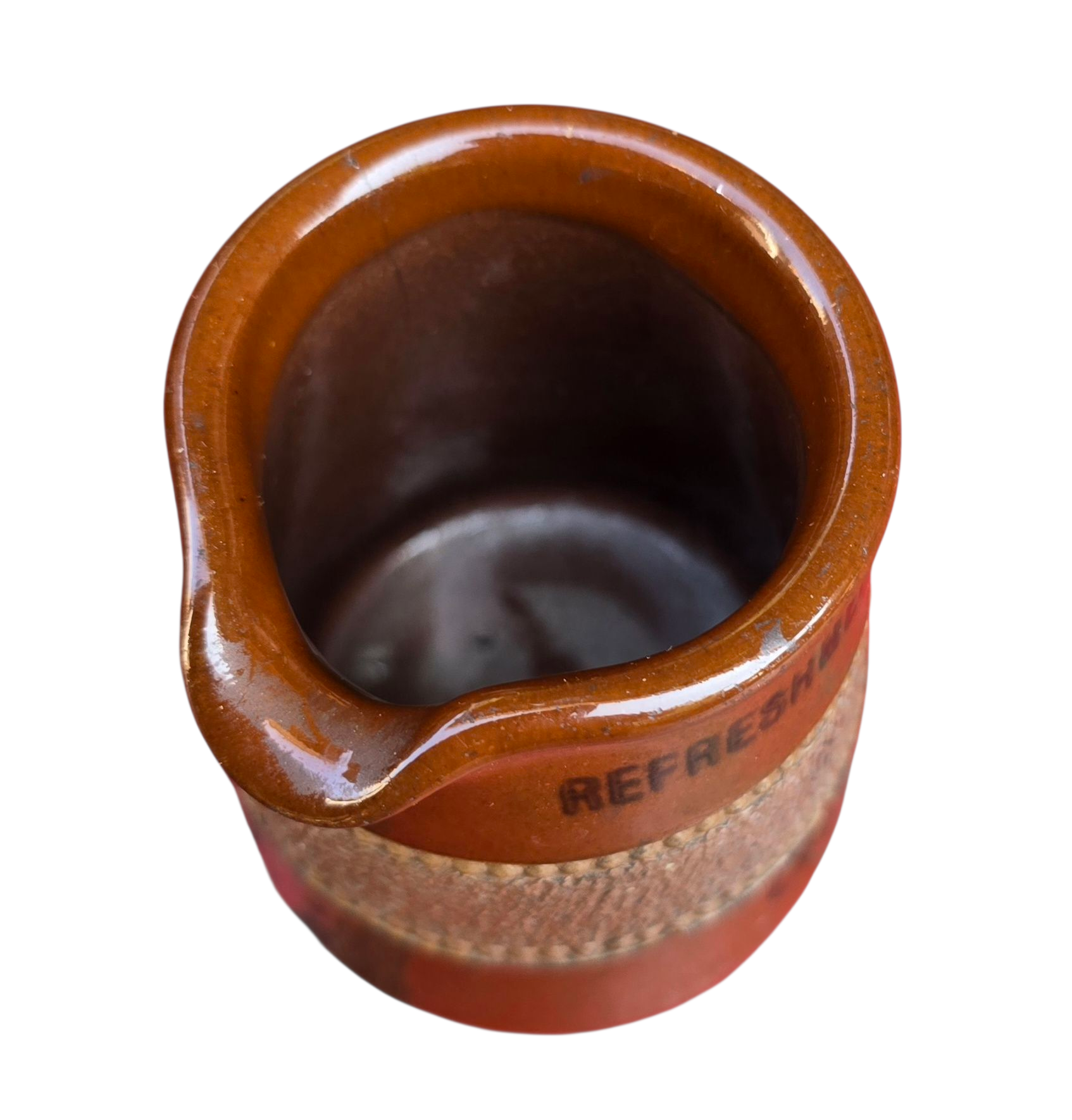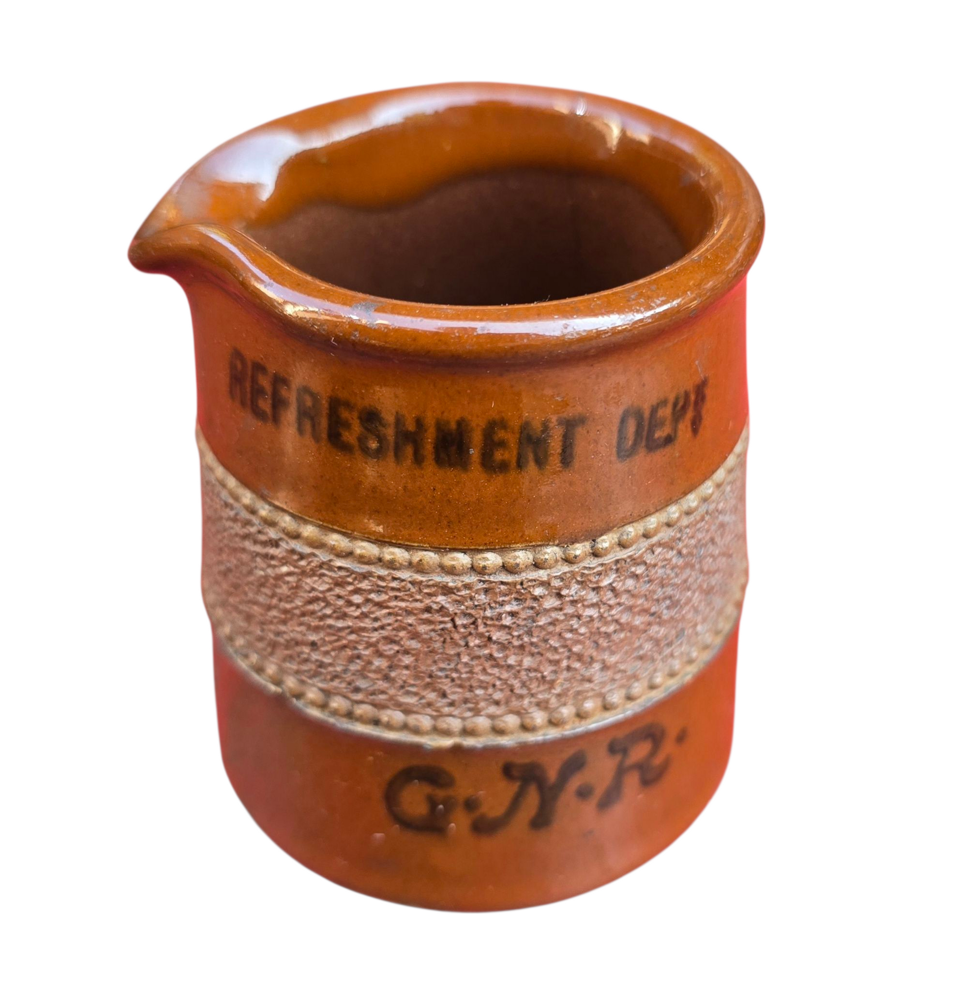 A stoneware glazed Great Northern Railway "refreshments dep't" small milk jug, this item is in perfect condition and measures 2 1/2" tall and 2 1/4" across the base.