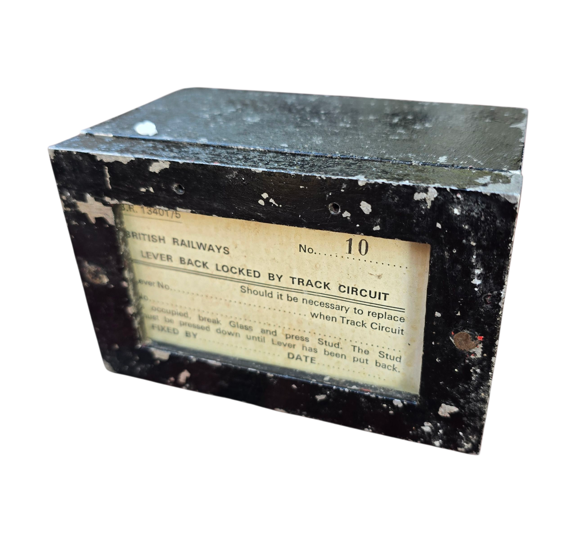 This BR-WR Alloy sealed release unit used by the signalman to override a track circuit during a failure which was preventing the points from being moved, he would break the glass which allowed the button to be depressed to allow the lock to operate. This unit is complete with glass, new ticket and retaining spring clip.