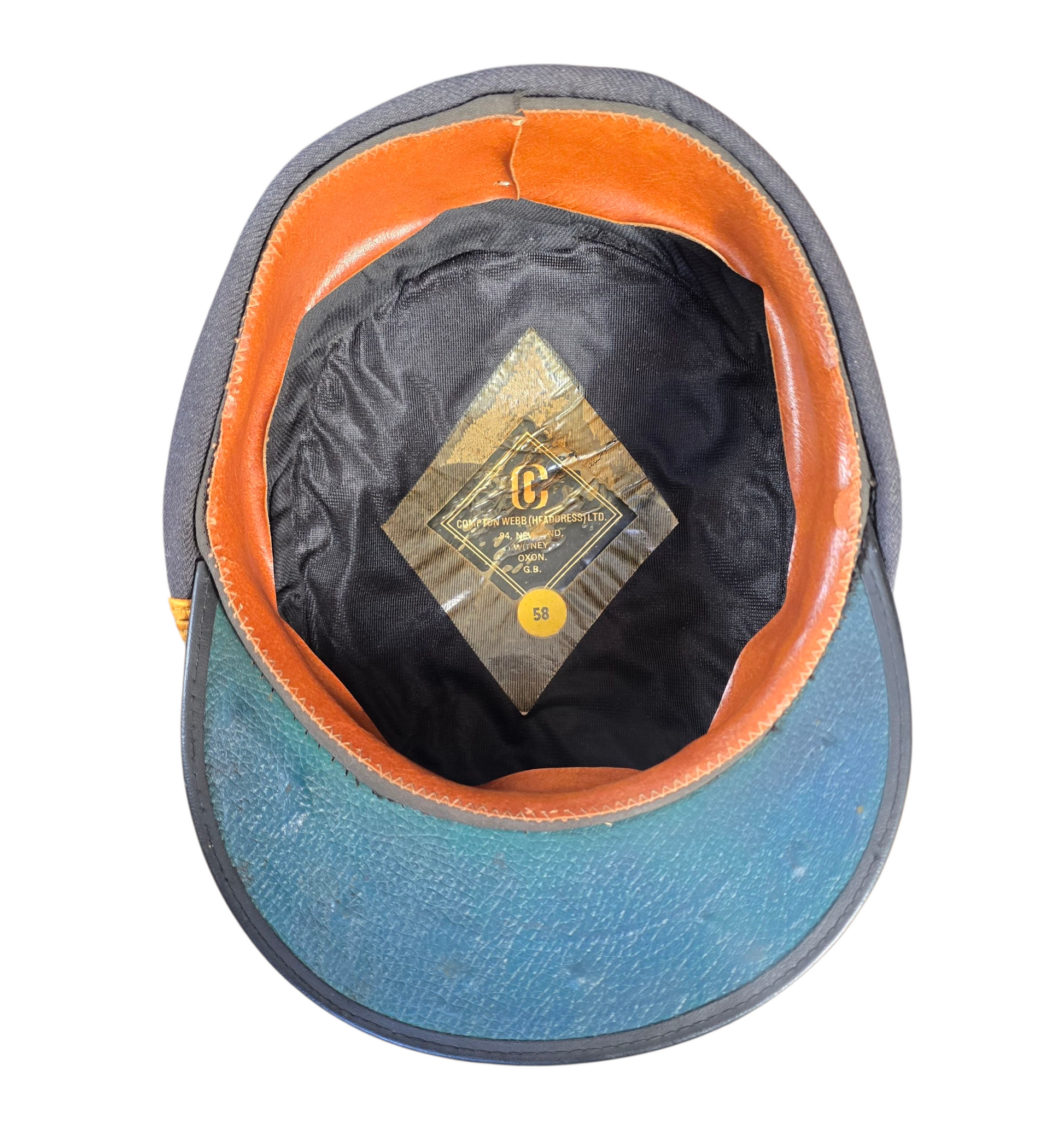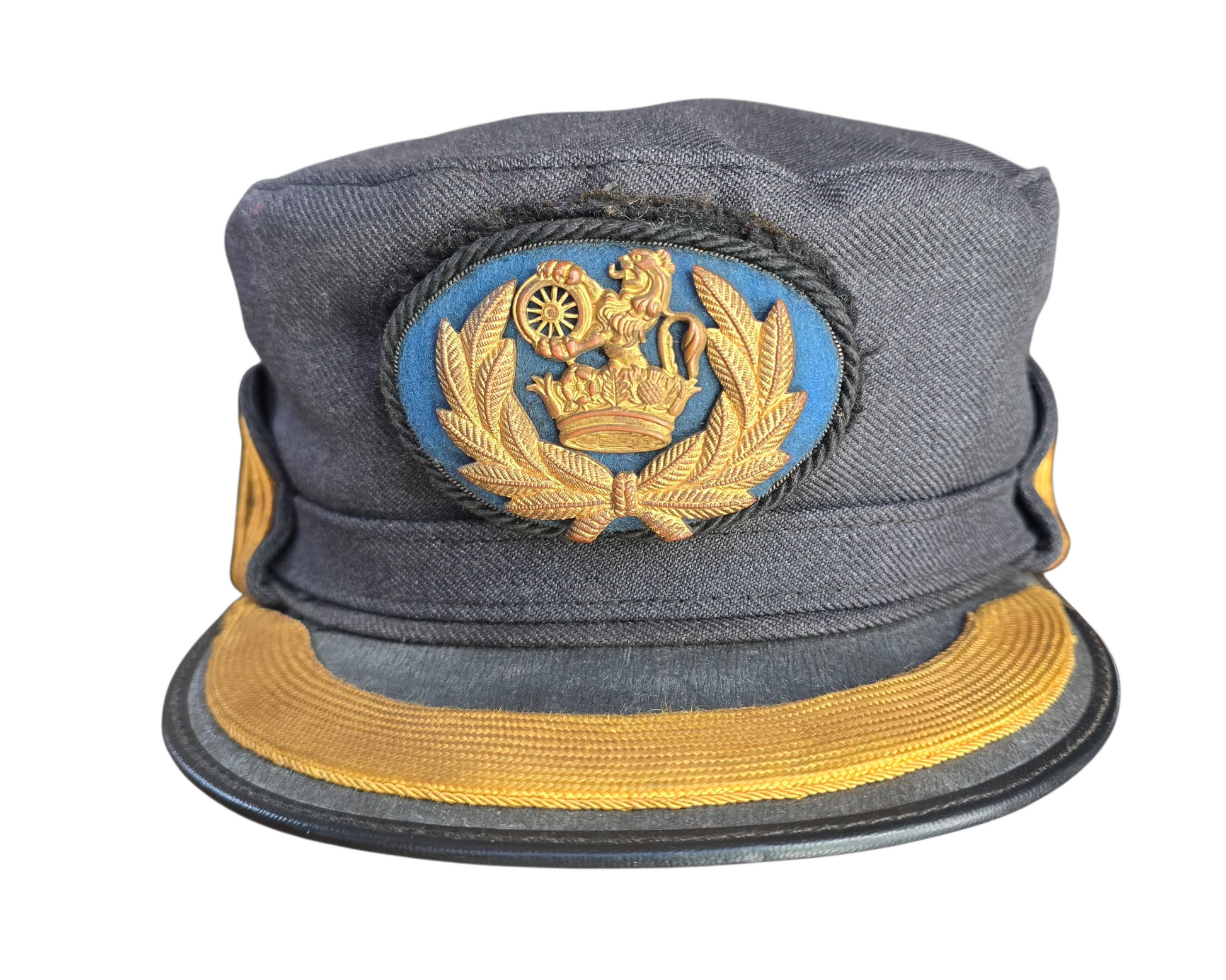 This particular hat represents the same design style of the first issue from 1964 but 2nd phase or batch. For reasons of cost reduction by British Rail the manufacturer produced these hats with yellow (gold) cloth cord rank/grade embellishment instead of the previous gold bullion wire around the hat and on the peak/visor. Further changes occurred with the introduction of large gilt double arrow badges applied directly to the hat without any padded felt cushion. The Station Managers were issued a dark grey uniform with grade markings around tunic cuffs, gilt buttons and respective badges.