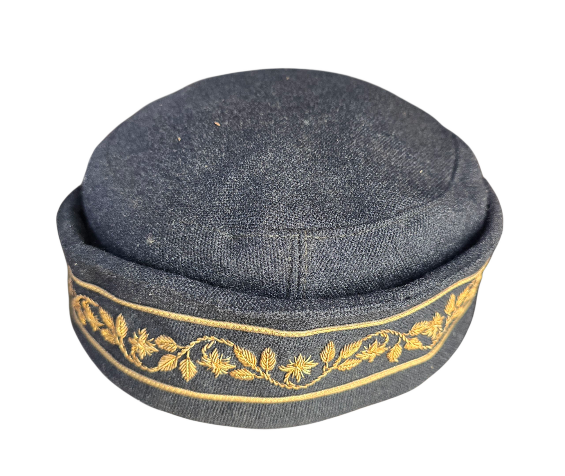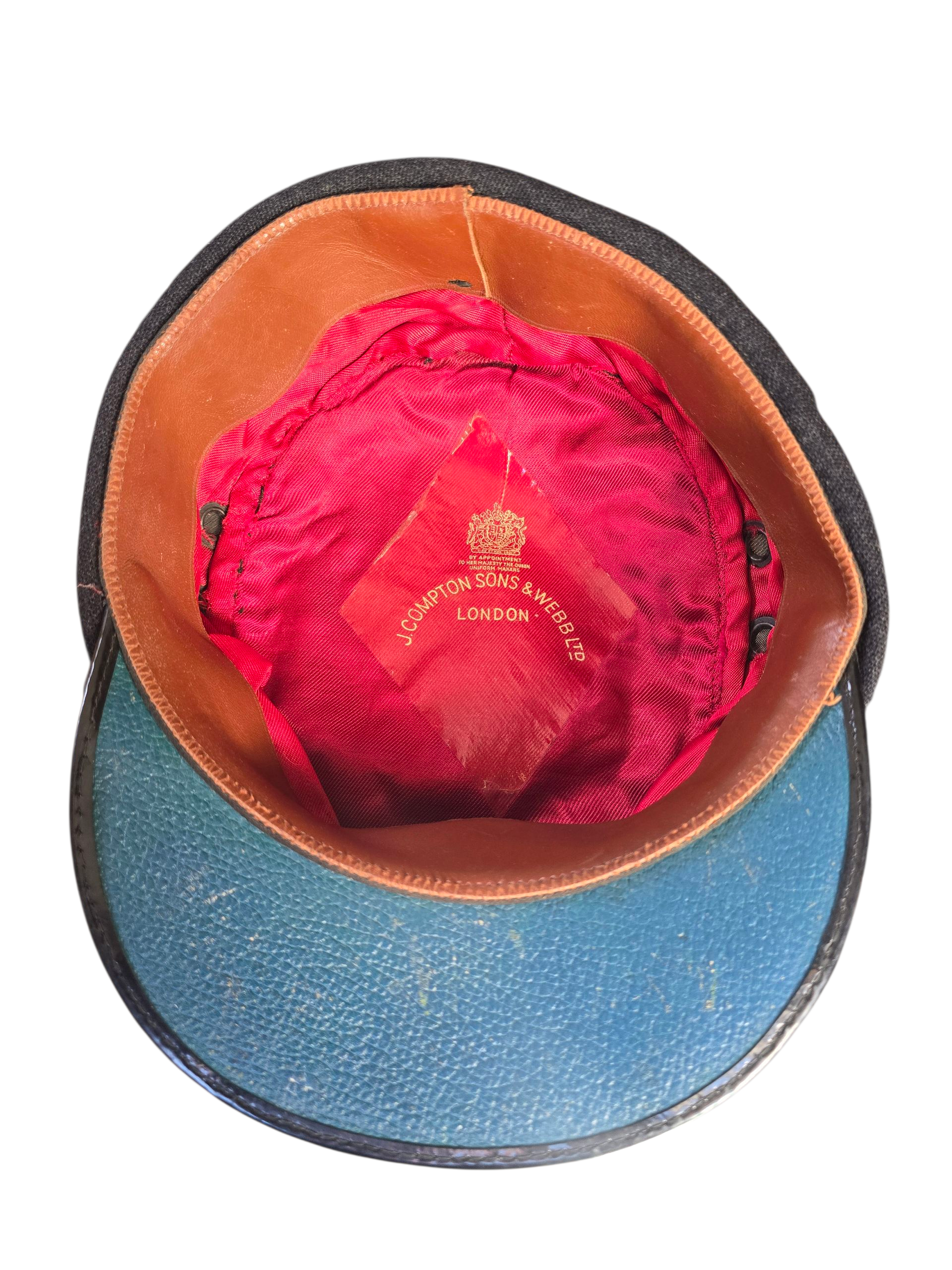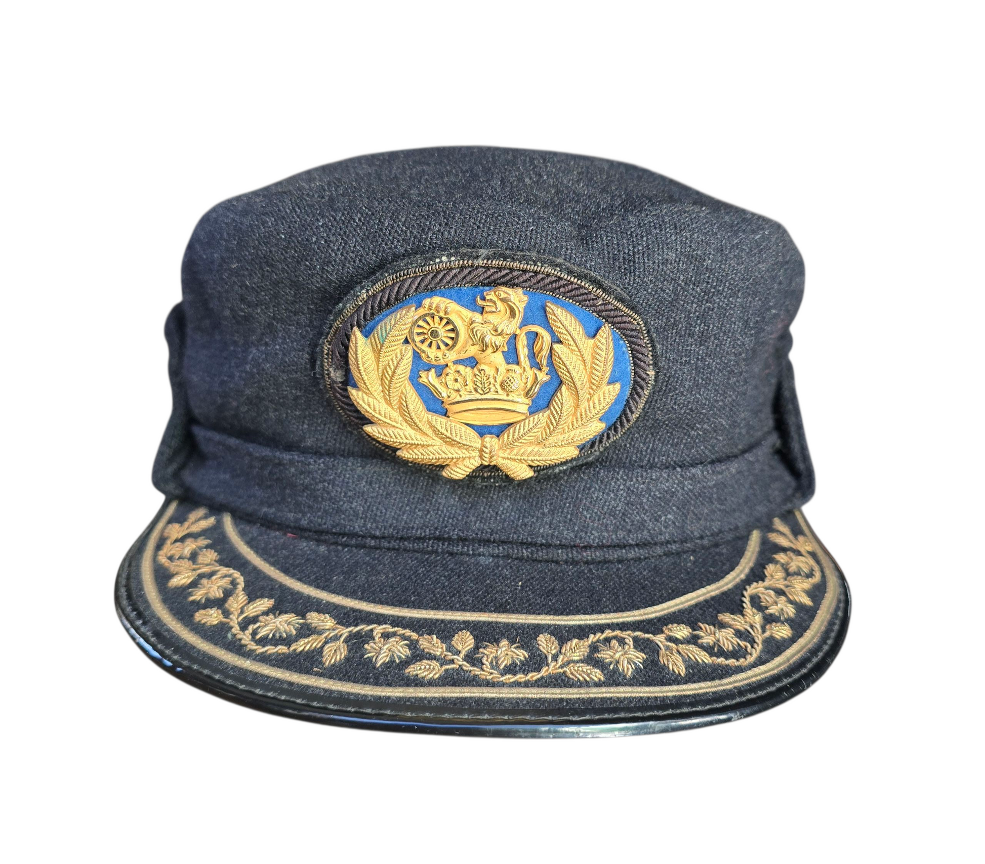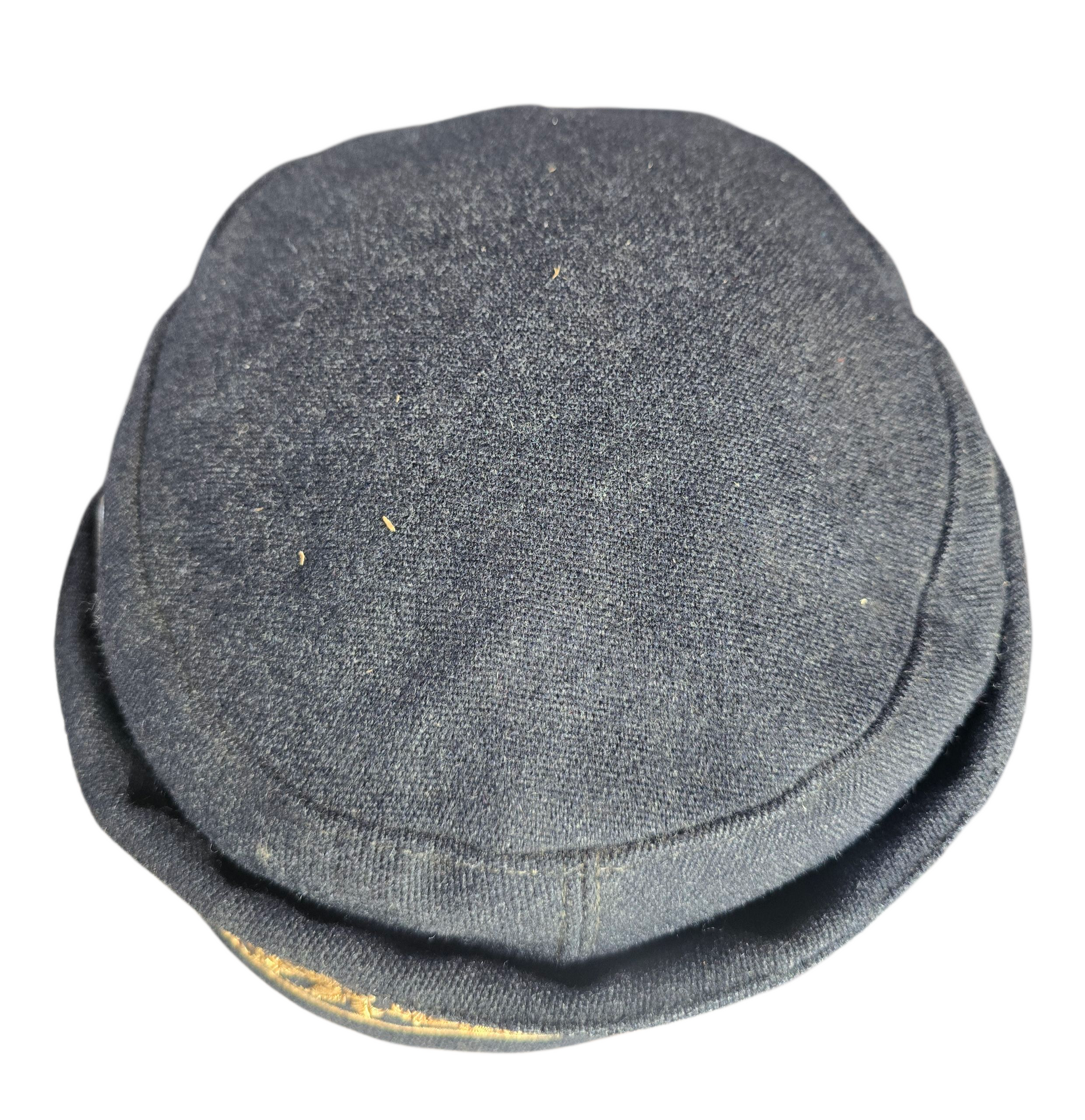 A Senior Station Managers hat , first issue. Issued from, 1964 at the time of the new Corporate Design image introduction to British Rail. This style of hat was issued to the "Top Man" at large rail centres. In practice it would only be worn when public facing, VIP attendance or ceremonial occasion. He was issued a plain dark grey civilian type suit without any embellishments, his hat only identified his rank of authority. From late 1965 these hats were being issued with the British Rail gilt double arrow on a red felt cushion background. This hat is a high quality item manufactured by J Crompton Sons & Webb Ltd, London and in excellent condition with no fading or moth damage.