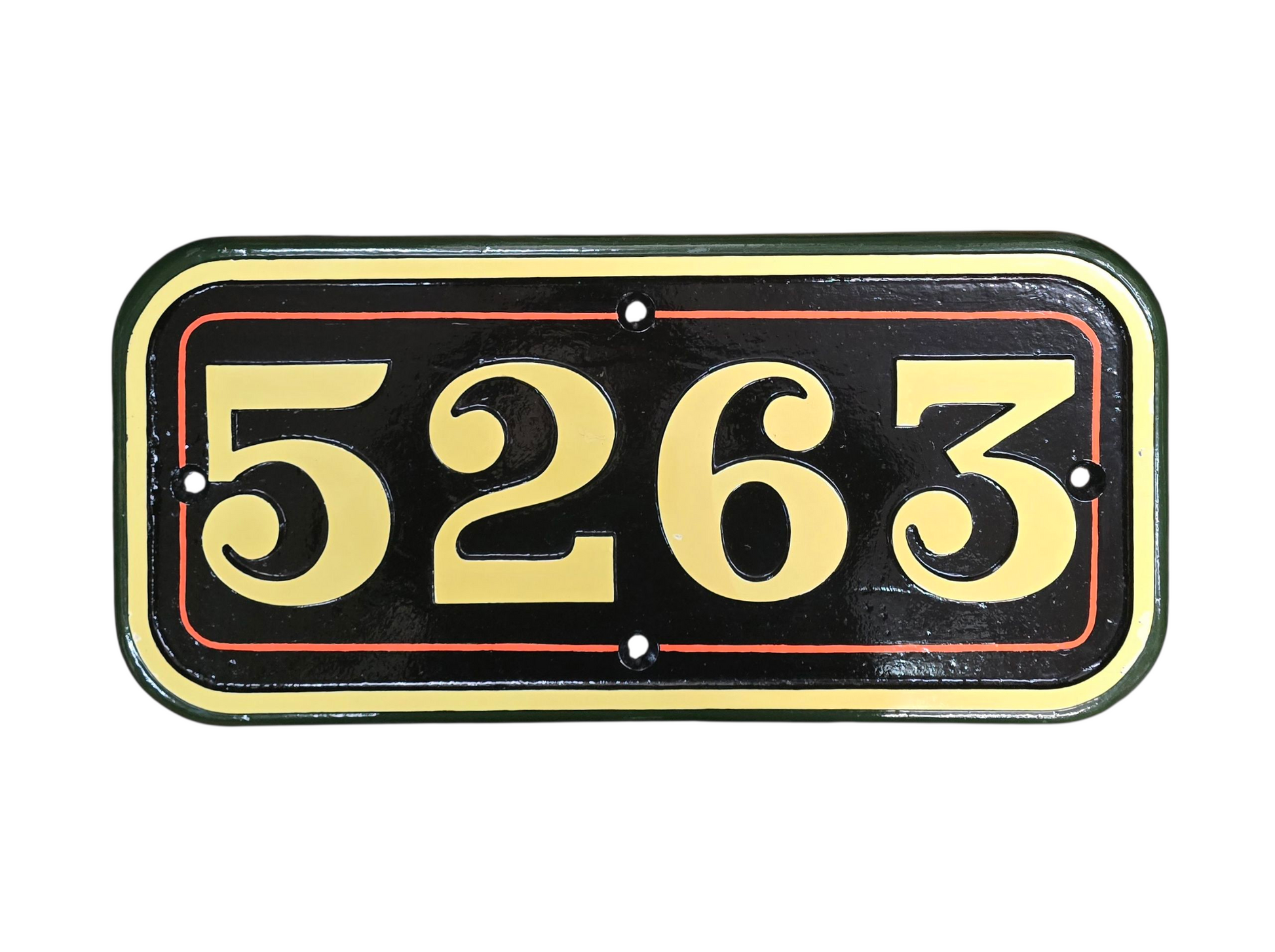 A cast iron cab side plate from ex G.W.R. 52XX class no 5263, this locomotive was built at Swindon works and entered service March 1926. The first shed it was allocated to was Llanelli the Banbury, Severn Tunnel Junction and last of all Barry. Withdrawn 29th May 1963 and scrapped March 1964, this plate was restored by us some years ago and is still in great condition.