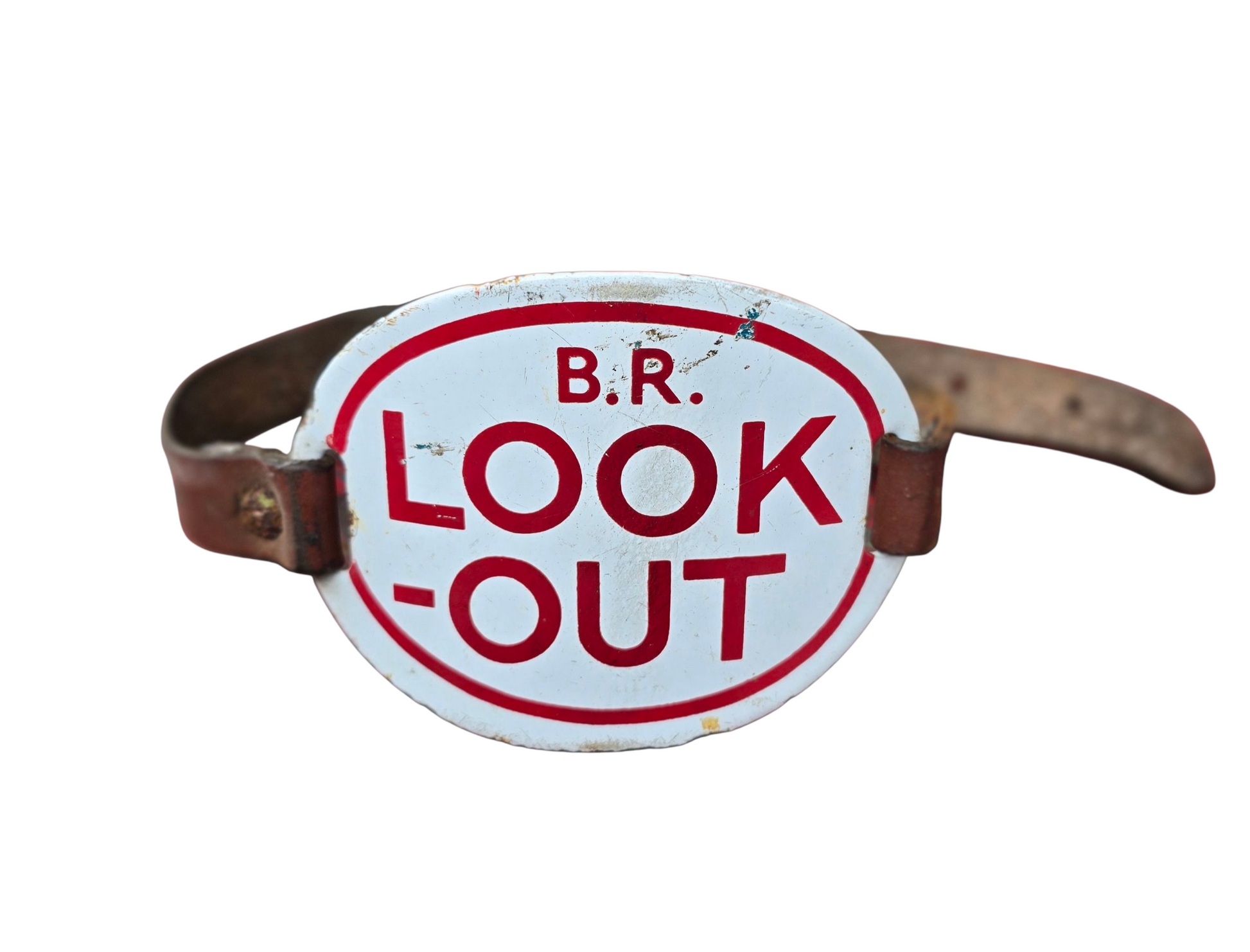 An early pattern enamel British Railways Look out man`s arm band, this item is in great condition and leather strap