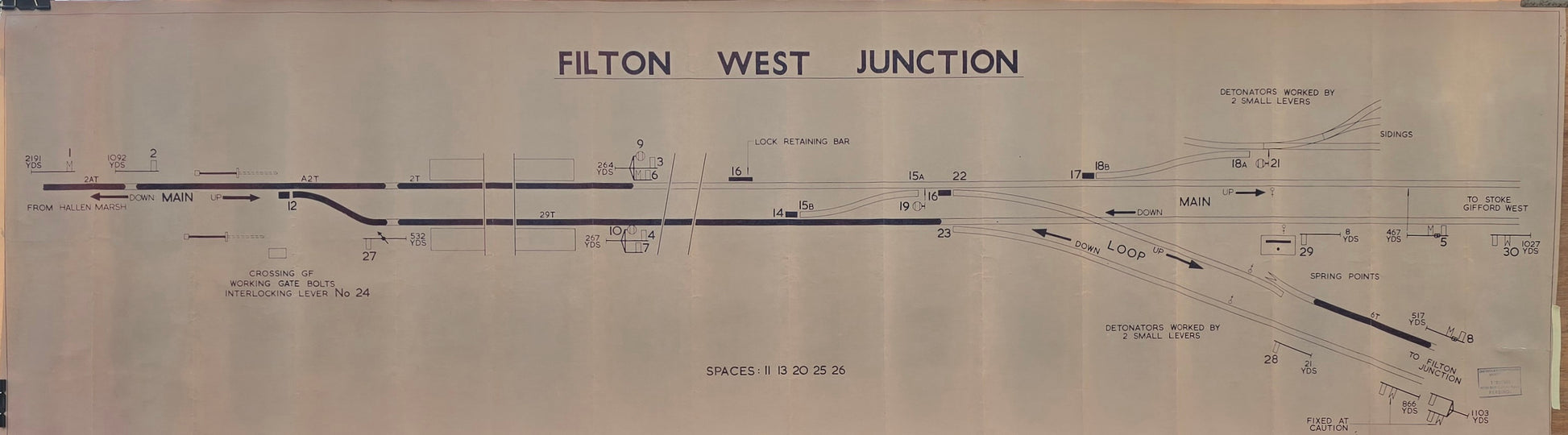 A BR-WR office copy signal box diagram of FILTON WEST JUNCTION which is in the Bristol area and controls the lines to Avonmouth from Filton Junction and Stoke Gifford West boxes. this diagram is in good ex railway service condition.