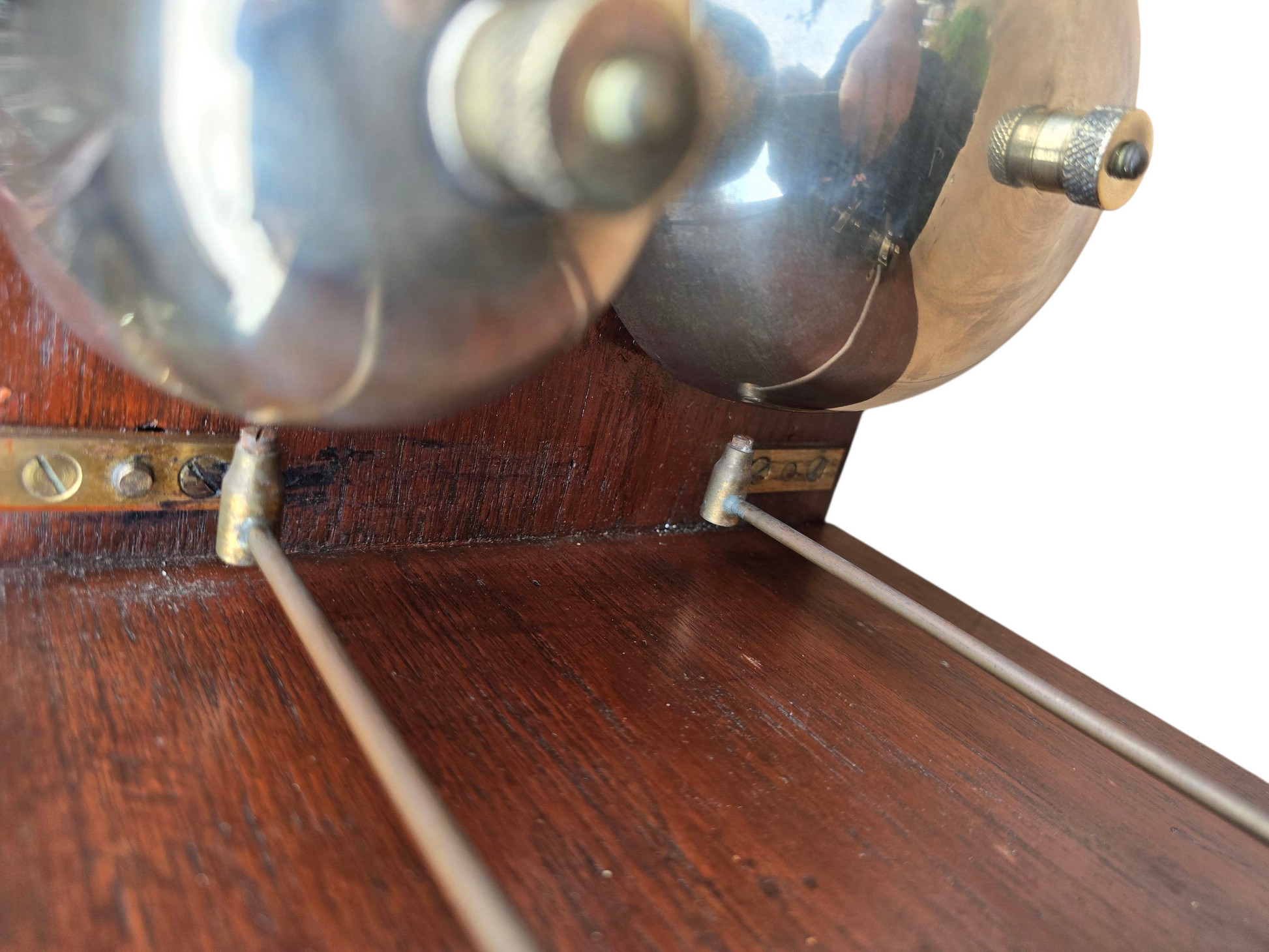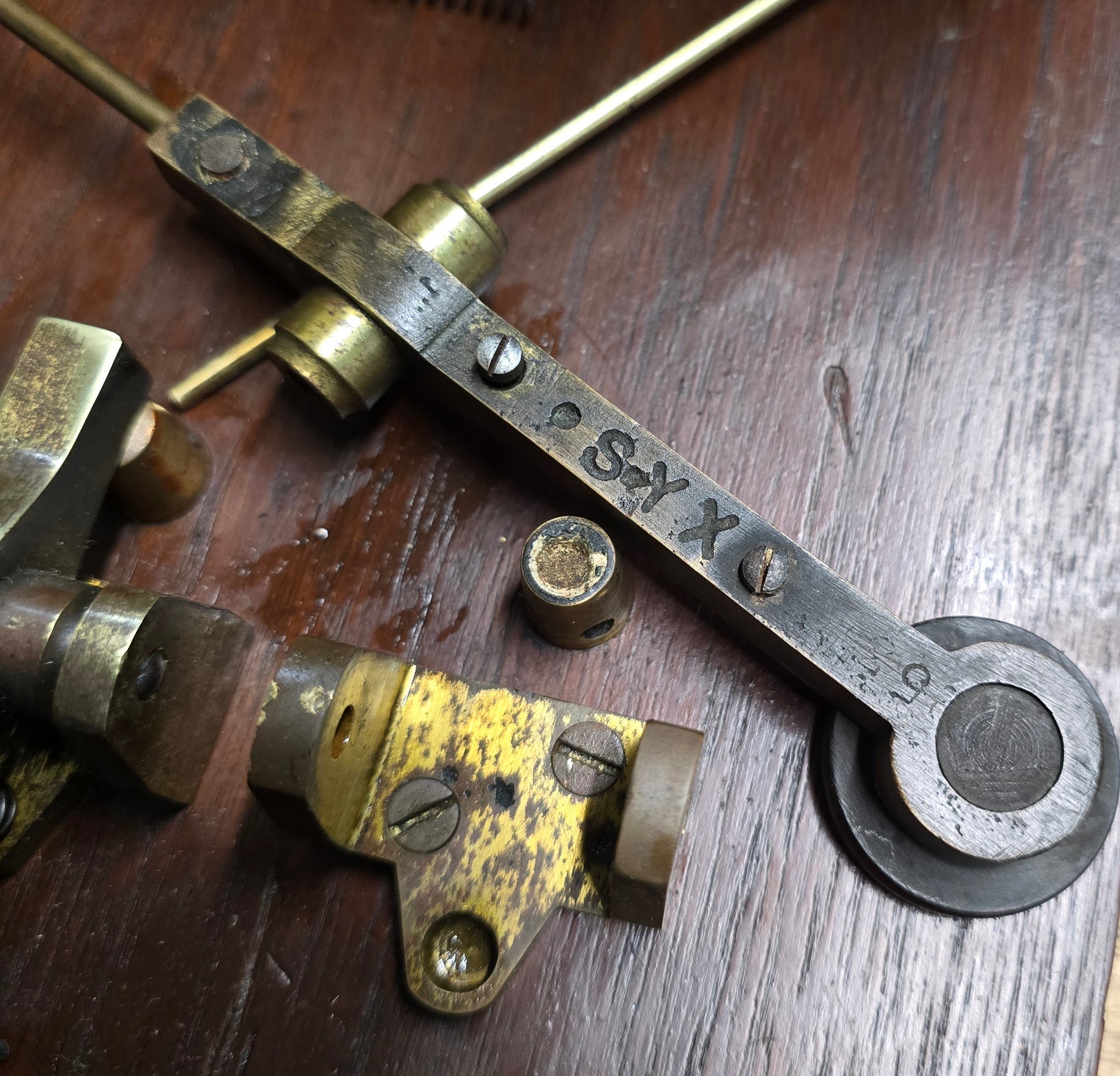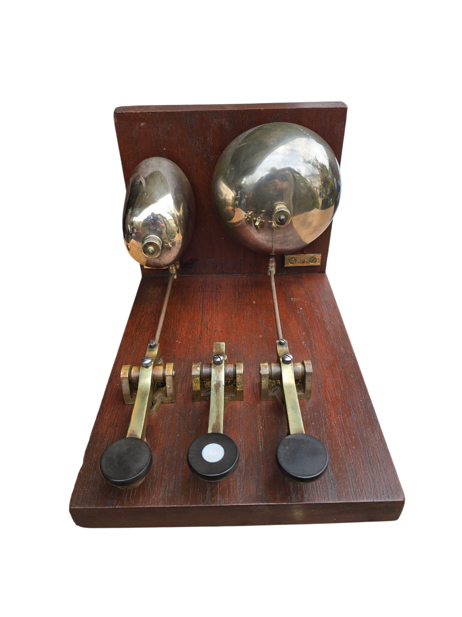 Signalling School training aid are very rare and seldom ever become available to buy by collectors, well here's your chance! This possibly unique signal bell code training instrument is an amazing find. This apparatus is equipped with three block bell tappers, the outer one have a bell striker attached to the tapper ends and when depressed strike the corresponding bell. The middle tapper is used to demonstrate the "mode of signalling" by representing "BOX B" which is where the trainee is always positioned and "BOX A & B" are either side, the trainer could use the middle tapper to test students on bell signal recognition. The outer tappers to reply with the relevant codes. This item was most likely made by W.R.Sykes and the tappers are marked as such and the pair of thumbscrews are classic Sykes. This item has been through our workshops as cleaning and freeing off of seized parts, it was at this stage that the full identity was discovered.