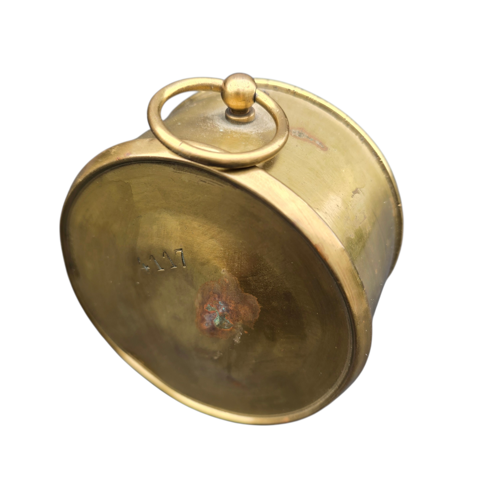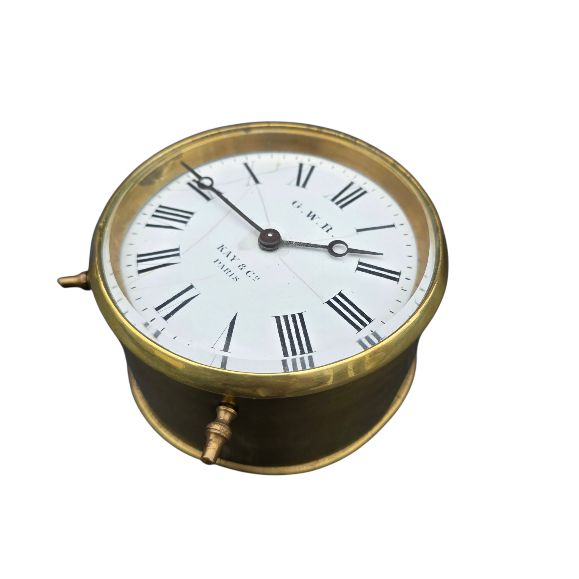 A Great Western Railway brass cased drum clock supplied by Kays 7 Co of Worcester, this fine timepiece was manufactured in Paris around 1880 and the G.W.R. supplied them to most of their signal boxes. This example has received a full strip down, clean and full service, additionally a new Swiss made platform escapement has been fitted. The case ,back cover and clock plate are all stamped with matching numbers 4117 and the winder has been modified by the G.W.R. Reading clock department. The enamel face has hairline cracks commensurate with its 130 plus years!