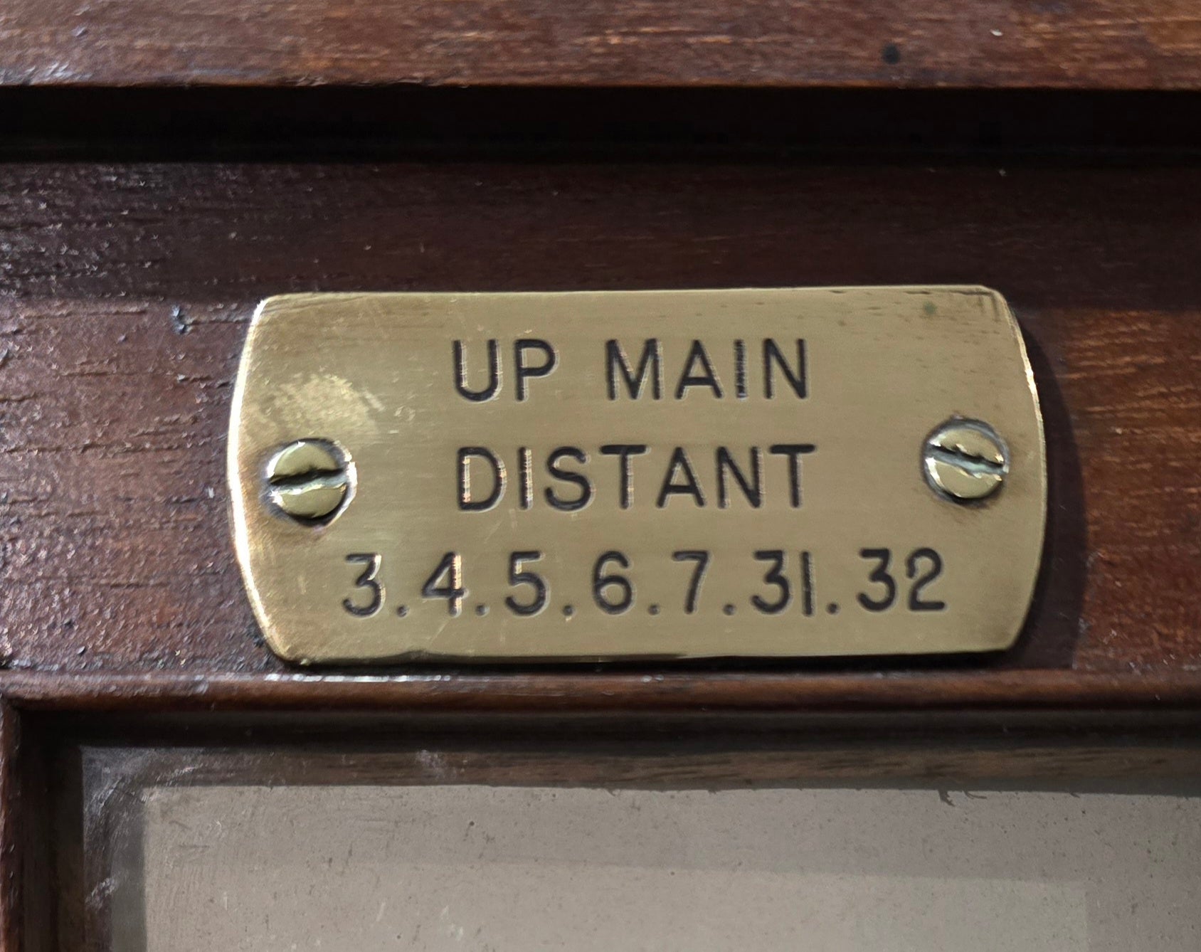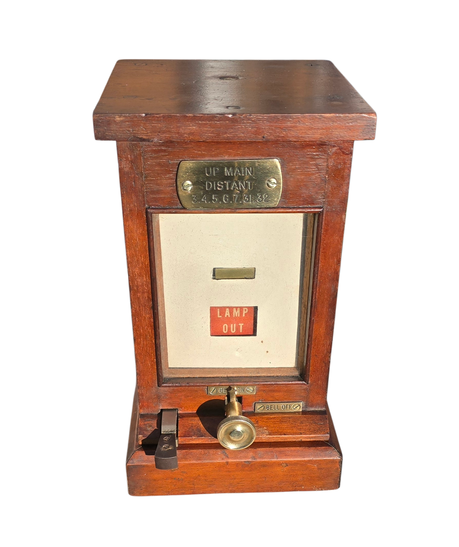This G.W.R. wood case signal lamp repeaters are superb instruments as they do so much to advise the signalman that the oil lamp at the signals/signals are burning, this example is quite superb as it has a very interesting brass plate showing it repeats no fewer than 8 signal lamps including the UP DISTANT. This instrument is in excellent condition and in tested working order.